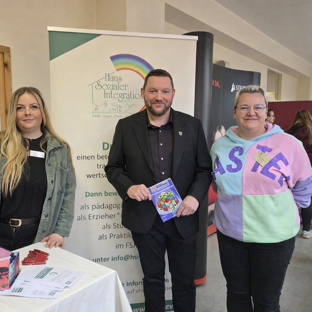 Zahlreiche junge Menschen nutzten die Gelegenheit, sich über die Ausbildung zum Erzieher oder zur Erzieherin zu informieren oder mit uns über offene Stellen und Einstiegsmöglichkeiten ins Gespräch zu kommen. Neben dem regen Austausch mit Interessierten, entstanden wertvolle Gespräche mit Netzwerkpartner*innen. Besonders gefreut haben wir uns über den Besuch von Bürgermeister Götz Herrmann, der unseren Stand besuchte und den Stellenwert sozialer Berufe unterstrich.