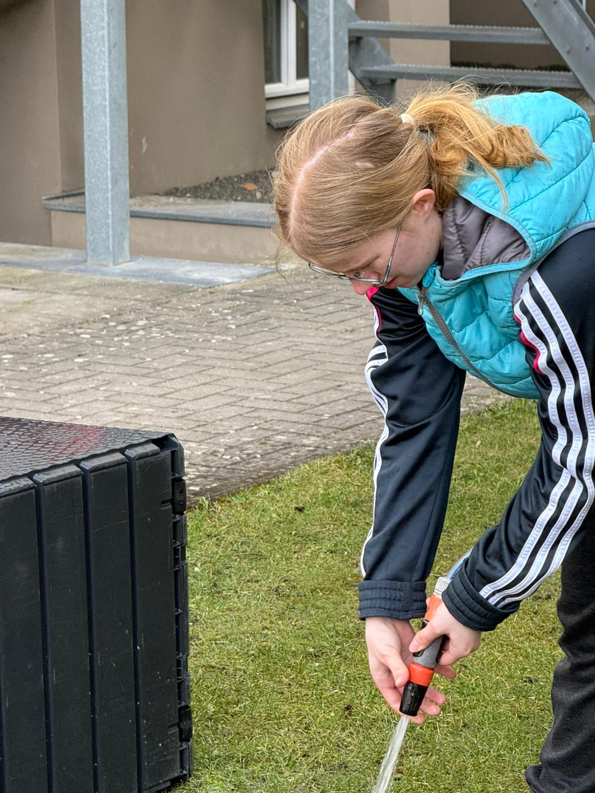 Mit viel Engagement und Teamarbeit wurde aufgeräumt, verschönert und neugestaltet: Es wurden Blumen gepflanzt, Müll eingesammelt und die Sitzecke wiederhergerichtet, sodass sie nun zum Verweilen einlädt. Auch der Fahrrad- und Lagerraum wurde gründlich aufgeräumt. Für Bewegung und Spaß sorgen jetzt wieder ein aufgestelltes Trampolin, ein Basketballkorb sowie ein Fußballtor. Zusätzlich haben wir das Unkraut entfernt, damit alles in neuem Glanz erstrahlt.